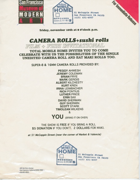 Evenings at TMH were filled with a sense of conceptual innovation and intellectual curiosity. The flyer for my inaugural screening proclaimed “CAMERA ROLLS + sushi rolls … BRING IT ON OVER!” To this day I still remember the most beautiful camera roll, by Timoleon Wilkins, of flowers in the blaze of a lightning storm, violet and midnight blue. I’ve never seen or heard of it again. Once familiar with my surroundings, I was drawn further into TMH’s recesses, in the form of “Lettrist Cinema: Jean Isidore Isou’s Venom and Eternity.” We were treated to Isou’s 1951 French classic and then slapped with the Total Mobile Home–made Howls in Favor of Sade, black-and-white leader set to a very odd English-with-horrible-French-accent sound track, full of piss and vinegar.